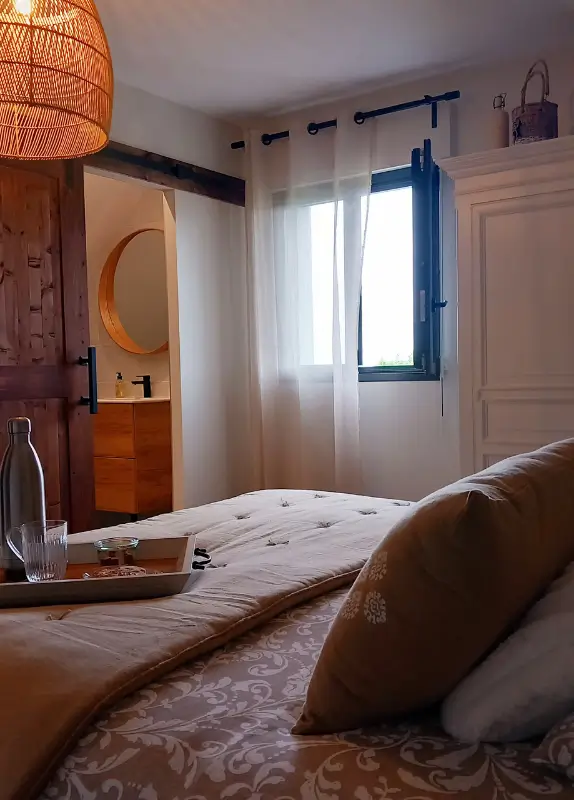 Pour cette chambre, la salle de bain, les toilettes et le salon sont partagés. Une belle cuisine aménagée et équipée est disponible pour préparer votre petit déjeuner (non compris dans la location), vos salades ou faire réchauffer vos plats.